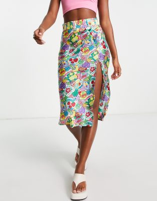 Daisy Street midi slip skirt in retro mix print satin with thigh slit