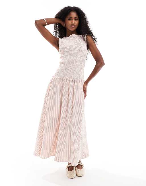 Daisy Street shirred dropped waist midaxi hem dress in red stripes