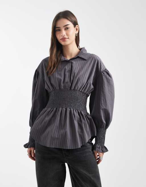 Daisy Street shirred waist shirt in gray and black stripes