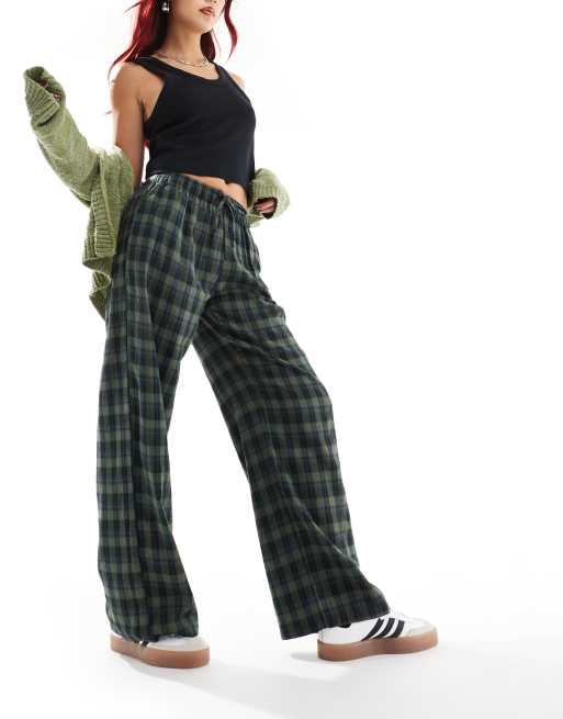 Daisy Street wide leg pull on pants in flannel green check