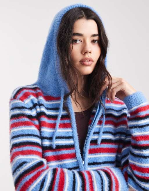 Daisy Street zip up fluffy knit with hood in blue and red stripe