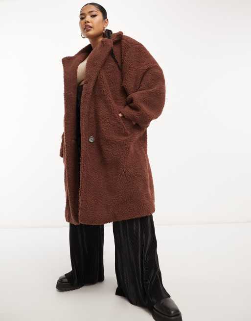 DTT Plus Teddy longline double breasted borg jacket in chocolate brown