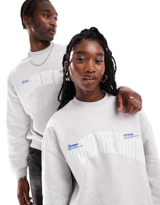 Dr Denim Kenan unisex relaxed fit Around The World embroidery heavyweight sweatshirt in light gray melange