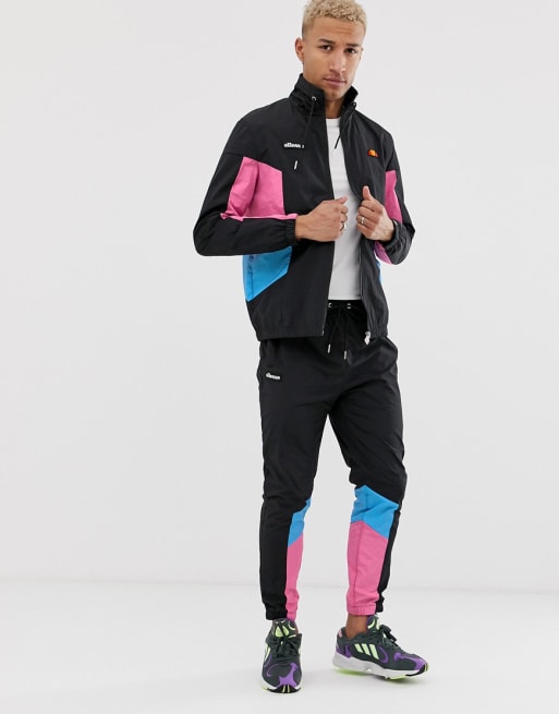 ellesse tracksuit with pink and blue panels in black