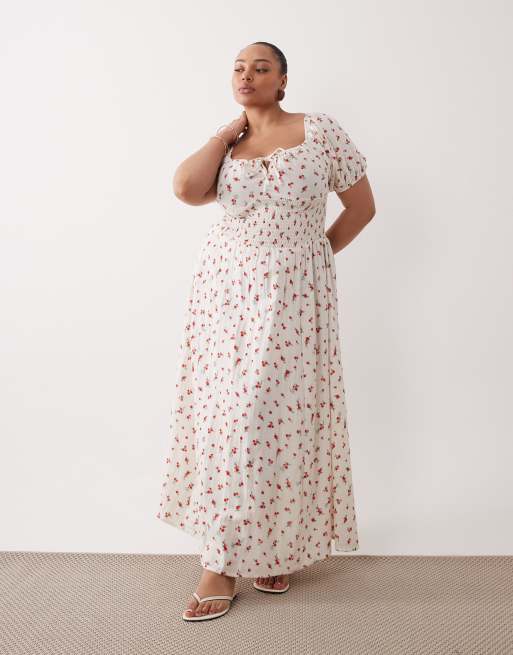 Esmée Curve puff sleeve tie front maxi beach dress in red delicate floral