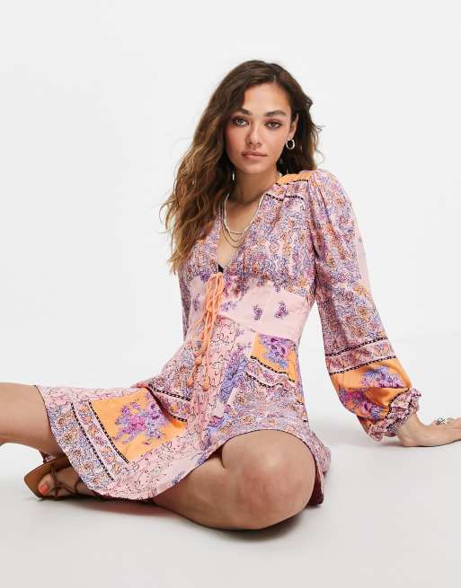 Free People Mixin' It Up mini dress with tie front in bright paisley print