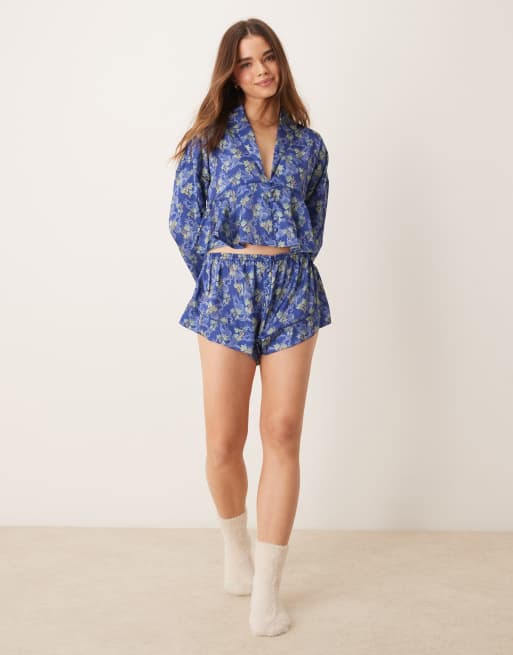 Free People printed satin pajama set in blue
