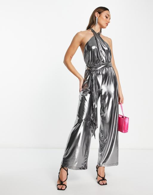 French Connection halterneck wide leg jumpsuit in high shine silver