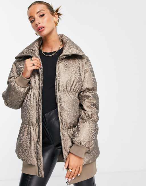 French Connection padded coat in gold leopard print