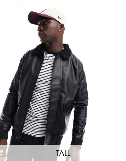 French Connection Tall faux leather flight jacket with borg collar in dark brown