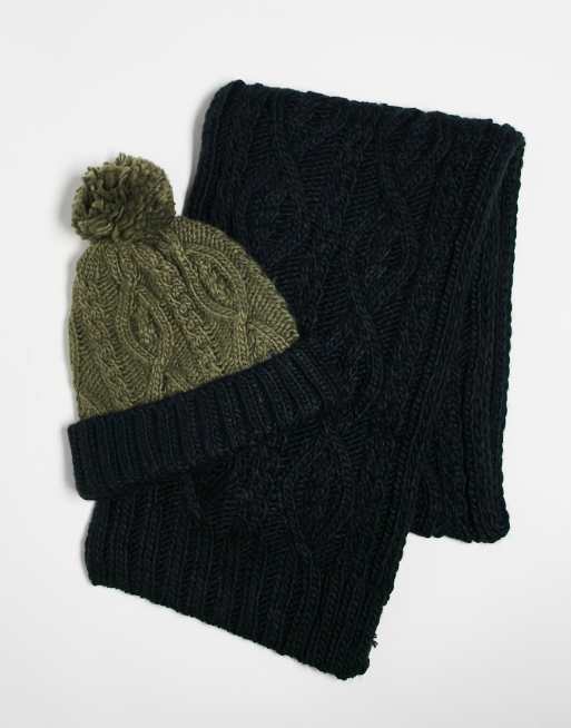 French Connection two-tone cable knit hat and scarf set in navy and green