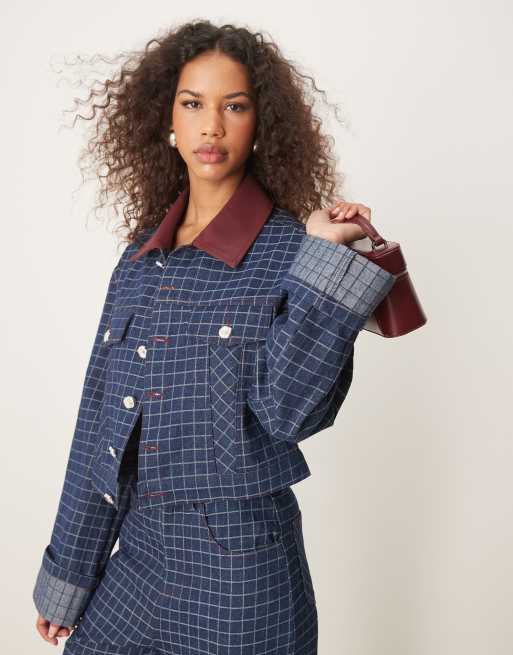 Ghospell contrast PU collar denim jacket in blue check - part of a set