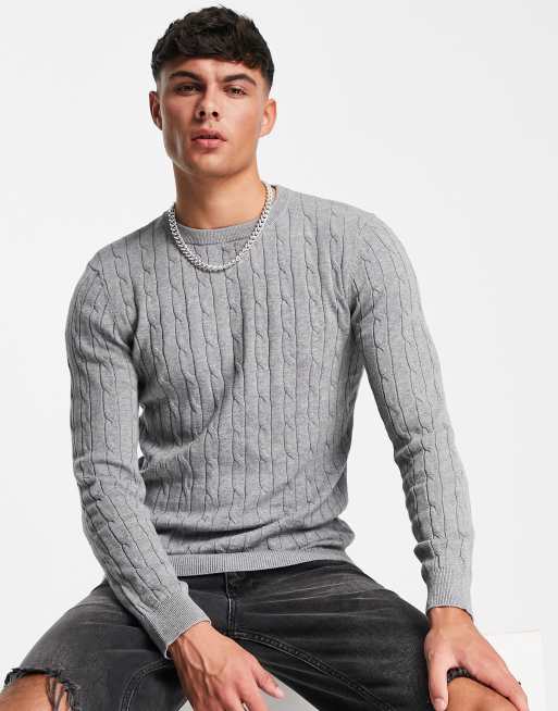 Gianni Feraud premium muscle fit crew neck cable knitted sweater in gray