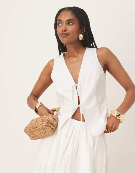 Gina Tricot linen mix vest top with tie front detail in white