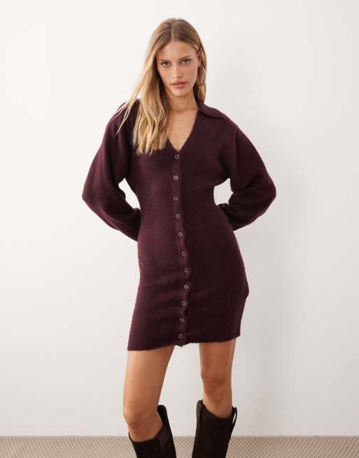 Gina Tricot long sleeve knit button down mini dress in burgundy