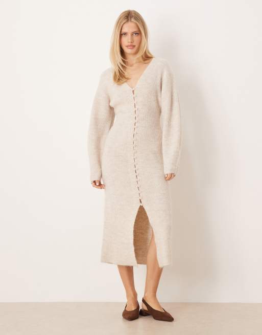 Gina Tricot long sleeve shaped knit midi dress in oat beige melange