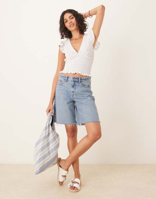 Gina Tricot short sleeve frill v neck top in white and blue print