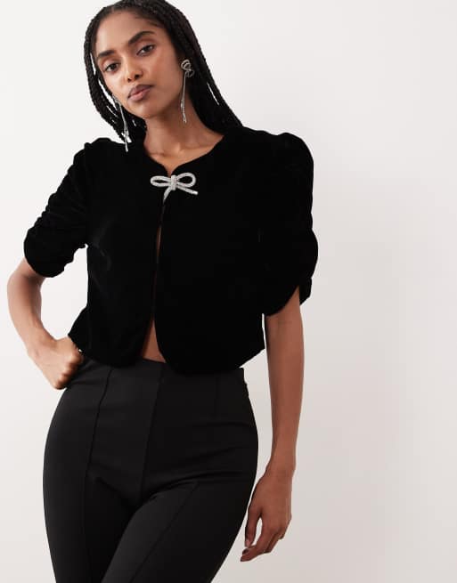 Gina Tricot short sleeve velvet velour blouse with silver-tone rhinestone bow in black