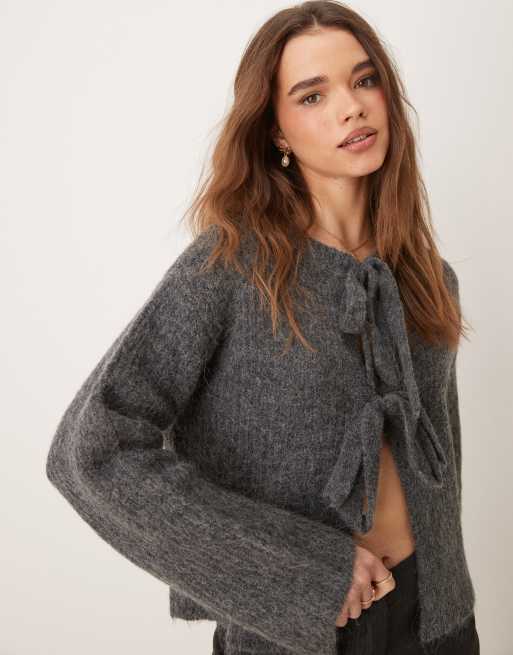 GINA TRICOT supersoft front bow tie detail rib knit cardigan in dark heather gray