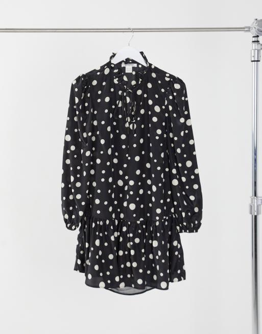 Glamorous mini smock dress with tie neck and peplum hem in polkadots