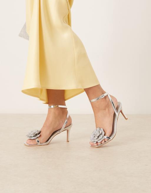 Glamorous stiletto heeled sandals wth flower details in silver