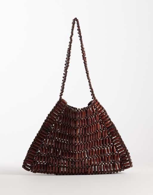 Glamorous wooden bead shoulder bag in dark brown