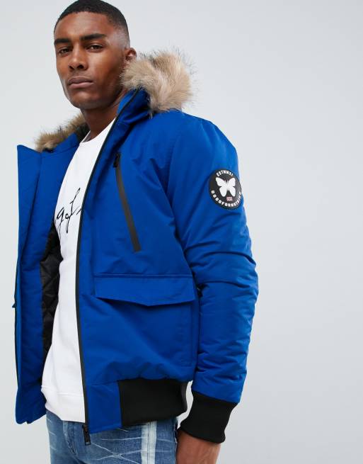 Good For Nothing bomber jacket in blue with faux fur hood