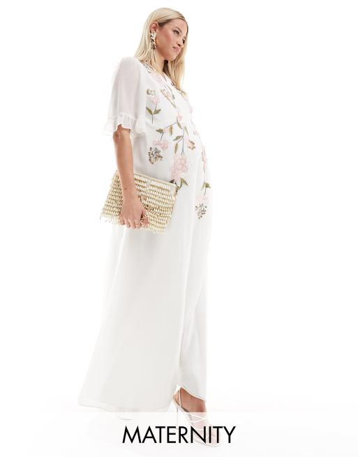 Hope & Ivy Maternity embroidered wrap maxi dress in ivory