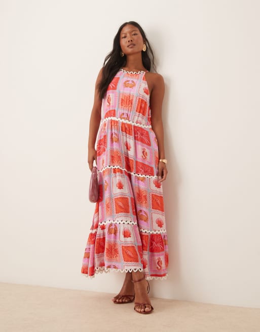 Hope & Ivy Petite rick rack high neck tiered maxi dress in pink beach print