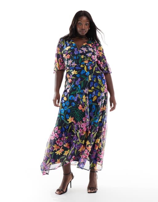 Hope & Ivy Plus flutter sleeve maxi wrap dress with tie waist in purple multi