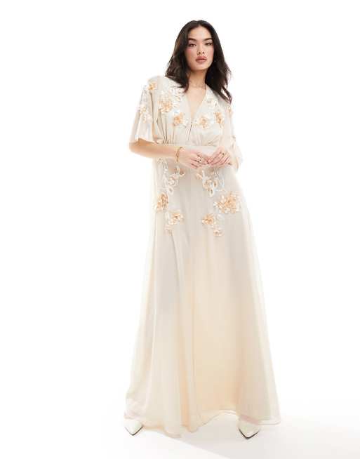 Hope & Ivy Bridal flutter sleeve embroidered floral maxi dress in cream