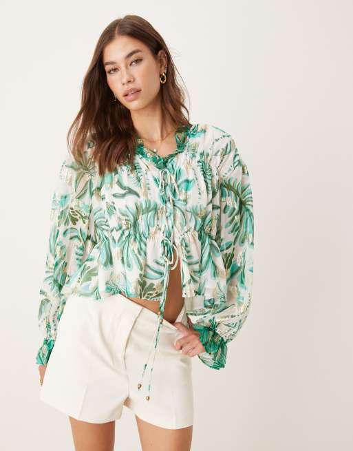 Hope & Ivy ruched tie front balloon sleeve top in green