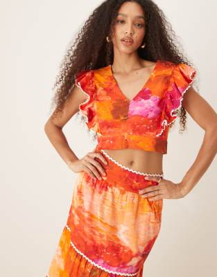 Hope & Ivy ruffle sleeve tie back cropped top in orange print - part of a set