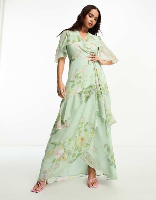 Hope & Ivy tiered ruffle wrap maxi dress in sage green