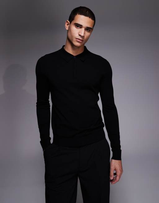 HUGO Red san pippo slim fit fine knit long sleeve polo shirt in black