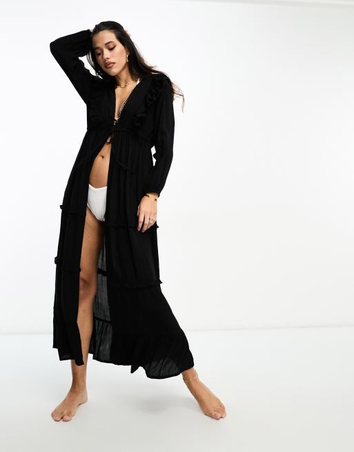 Iisla & Bird ruffle tie front tiered long sleeve maxi beach summer dress in black