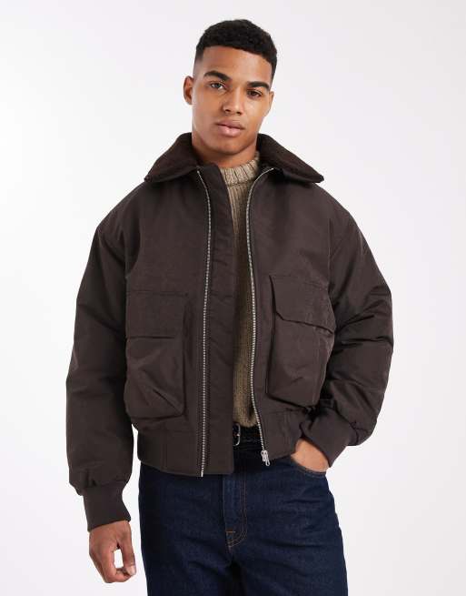 Jack & Jones bomber jacket with teddy collar in chocolate brown