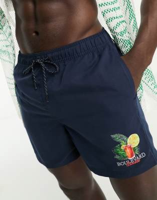 Jack & Jones Intelligence swim shorts with front print in navy