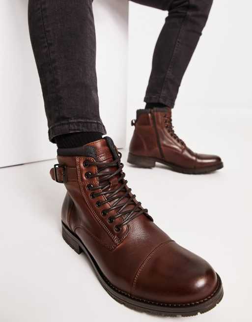 Jack & Jones leather lace up boots with cuff in brown