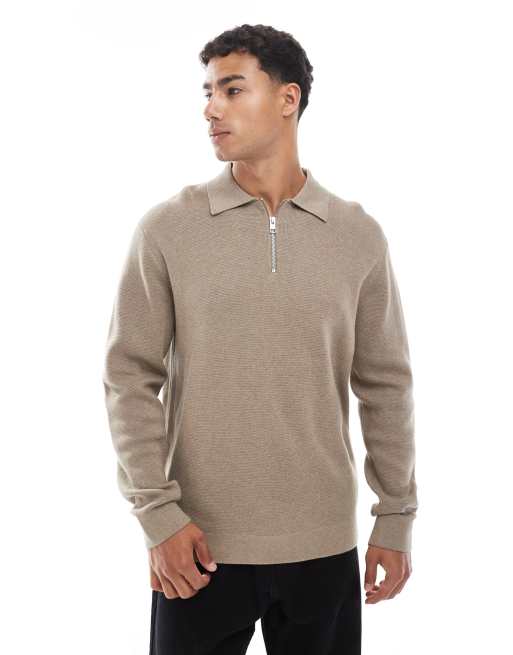 Jack & Jones premium long sleeve knit polo shirt with quarter zip in beige