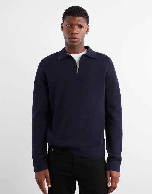 Jack & Jones premium long sleeve knit polo shirt with quarter zip in navy