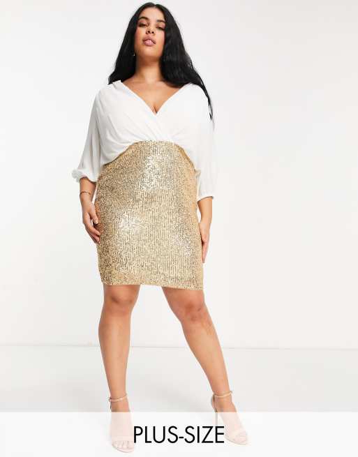 Jaded Rose Plus wrap blouse 2-in-1 sequin skirt dress in white and gold