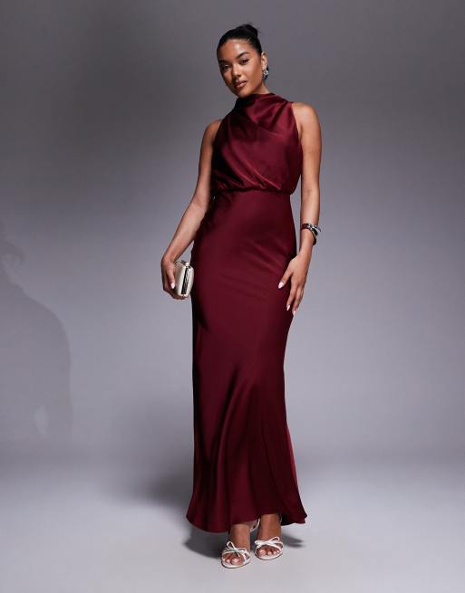 Jarlo high neck satin maxi dress in burgundy