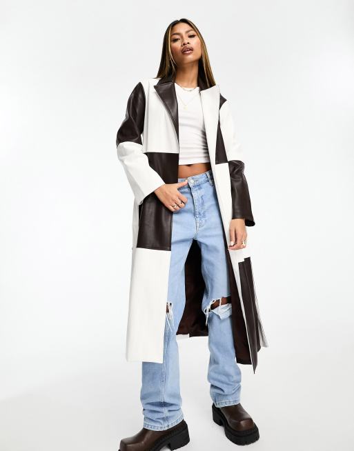 Jayley faux leather patchwork trenchcoat in brown and white