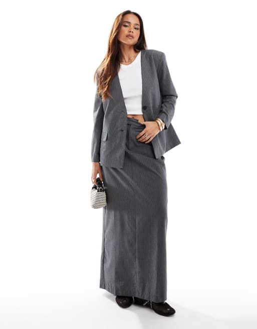 JDY tailored blazer & maxi skirt set in gray pinstripe