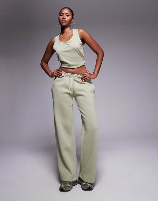 Kaiia cotton rich embroidered logo wide leg sweatpants in light olive - part of a set