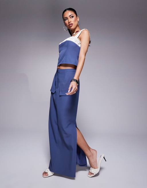 Kaiia exclusive contrast satin detail cami top & tailored pocket detail skirt set in blue
