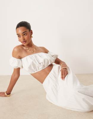 Kaiia exclusive cotton off the shoulder gathered puff detail crop top in white - part of a set