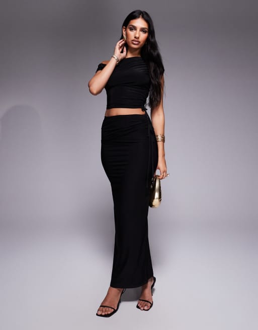 Kaiia exclusive double layered slinky ruched off shoulder drawstring crop top and maxi skirt set in black