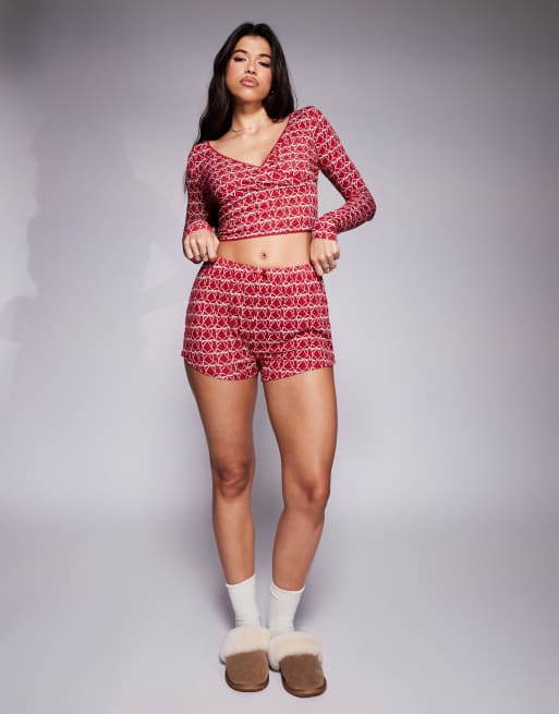 Kaiia exclusive mix and match cropped button through pajama top, shorts and bottoms set in burgundy bow print